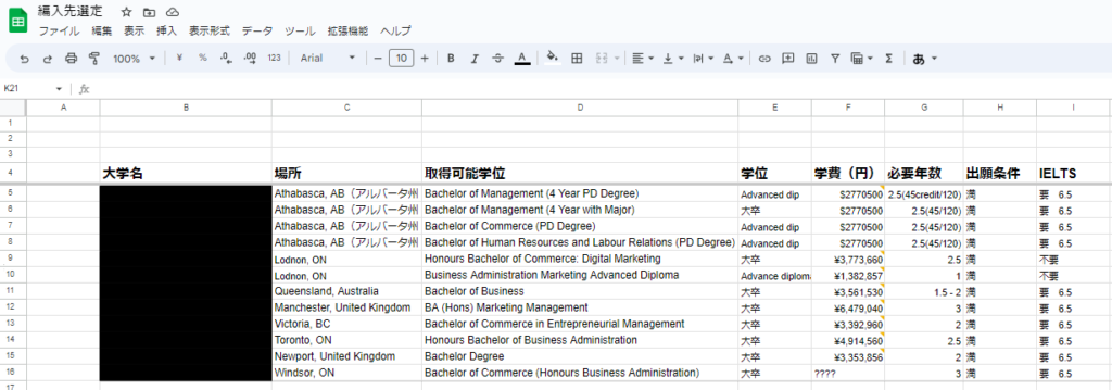 そして、いくつかの提携校大学をリストアップし、それぞれのアプライ条件、取れる単位数、学費などを調べていきました。